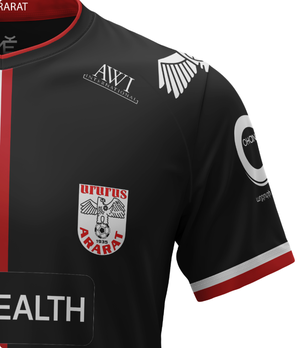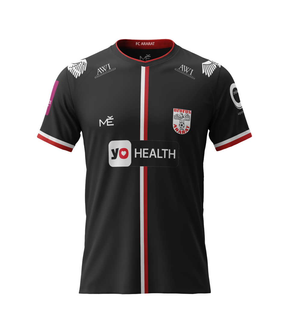 The official FC Ararat away jersey for the 2025/26 season. With a sleek black base and fine red and white stripes, it delivers a bold and elegant look. The collar features the Ararat Hoop Tour Armenian inscription, while the club’s iconic eagle spreads proudly across the shoulders. Produced by the Armenian brand Melante with a unique design.